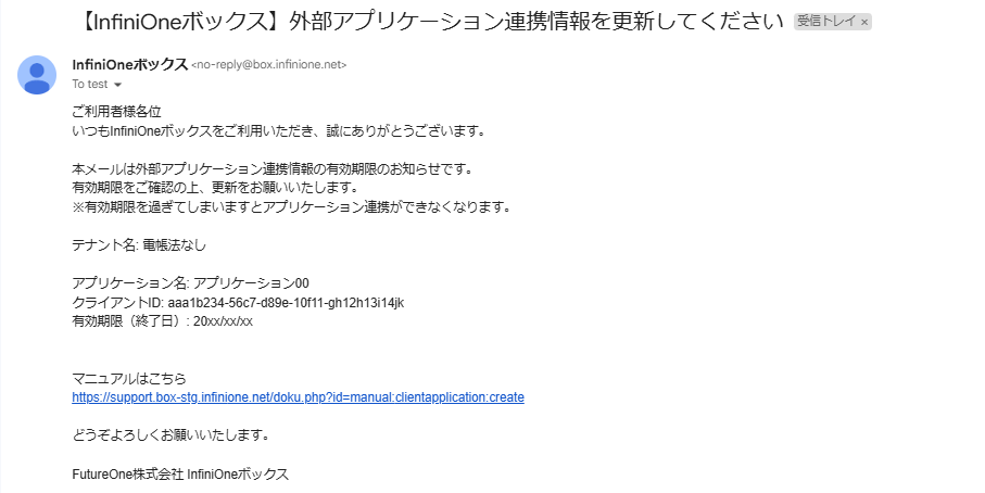 外部アプリケーション連携情報の有効期限が近付くと、下記画像のような通知メールがテナント管理者宛に届きます。
