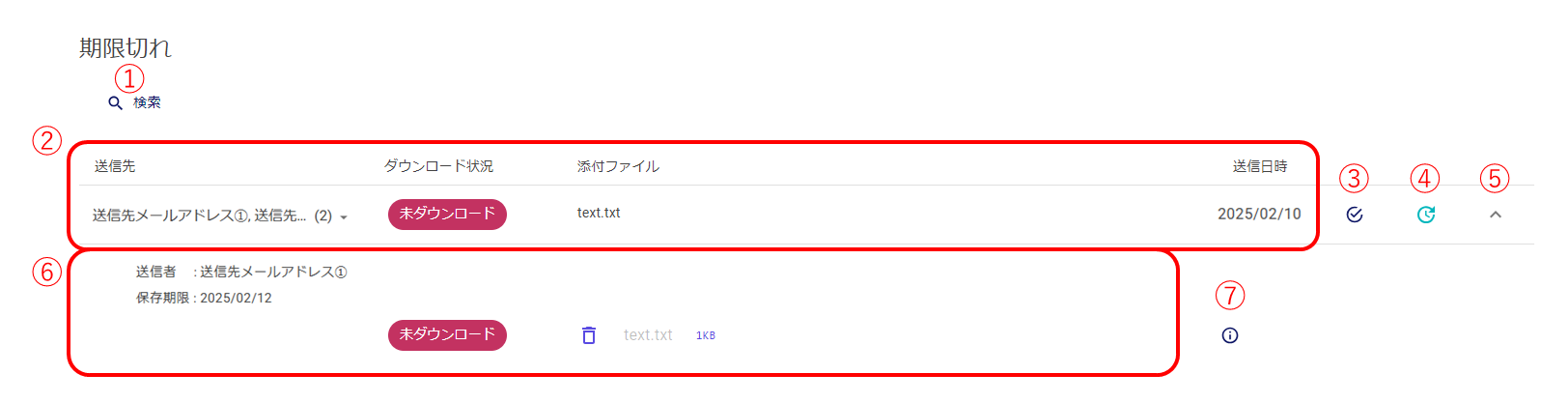 | ダウンロード状況 | ダウンロード状況が表示されます。。 複数の宛先に送った場合、送信先のうち誰か一人でもダウンロードした場合、ダウンロード済みに変化します。 送信先別のダウンロード状況は⑦ファイル履歴を確認してください。 FAQ:宛先の中に未ダウンロードの人がいるにも関わらず、ダウンロード状況がダウンロード済になっている |