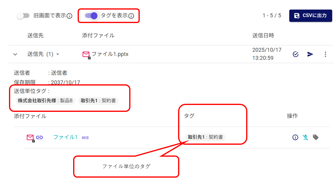 送信トレイのタグを表示をONにすると、ファイル単位・送信単位のタグが表示されるようになりました。
