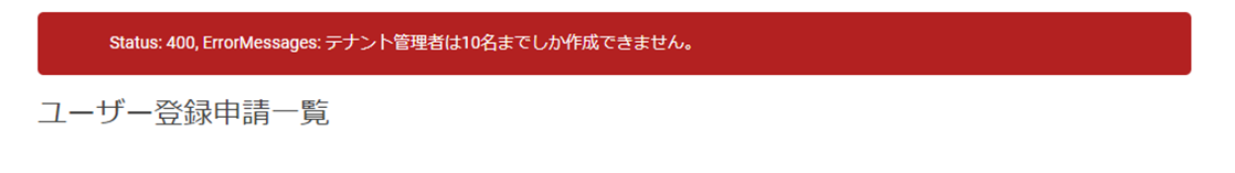上限を超えてテナント管理者を登録しようとすると以下のエラーが表示されます。