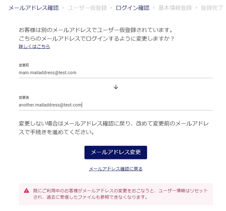 • 「メールアドレス確認」と「ログイン確認」で異なるアドレスを入力・選択しないよう注意する。
