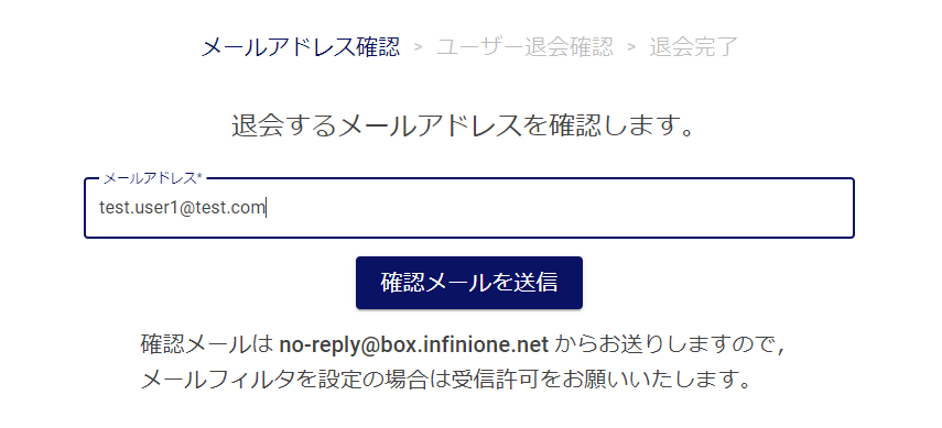 入力したメールアドレスに確認メールを送信します。 確認メールを送信クリックするとメール送信が行われます。