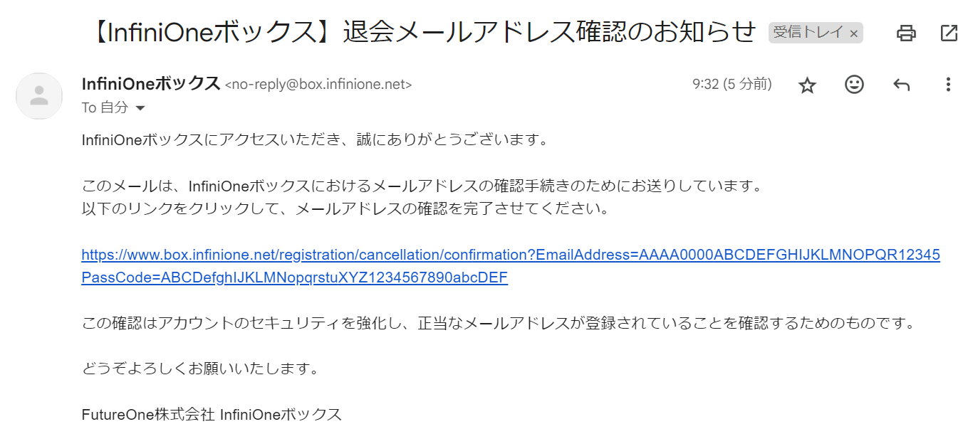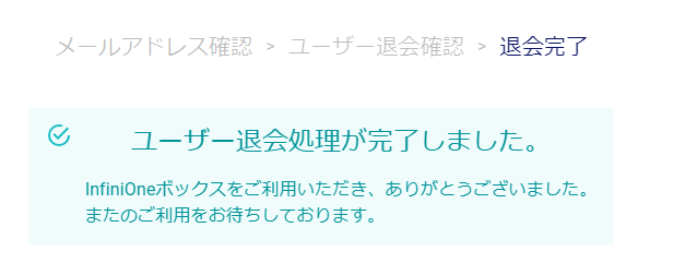 こちらの画面が表示されてば、退会が完了します。 再びInifiniOneボックスへログインする場合は、ユーザー登録から行ってください。