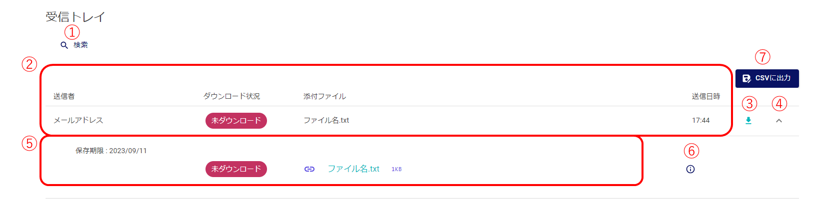 | 添付ファイル | 送信されたすべてのファイル名が表示されます。 当日中の場合は、時間が表示されます。 |