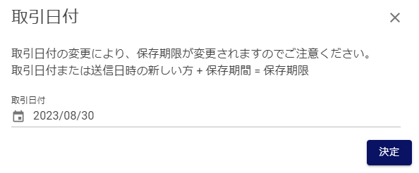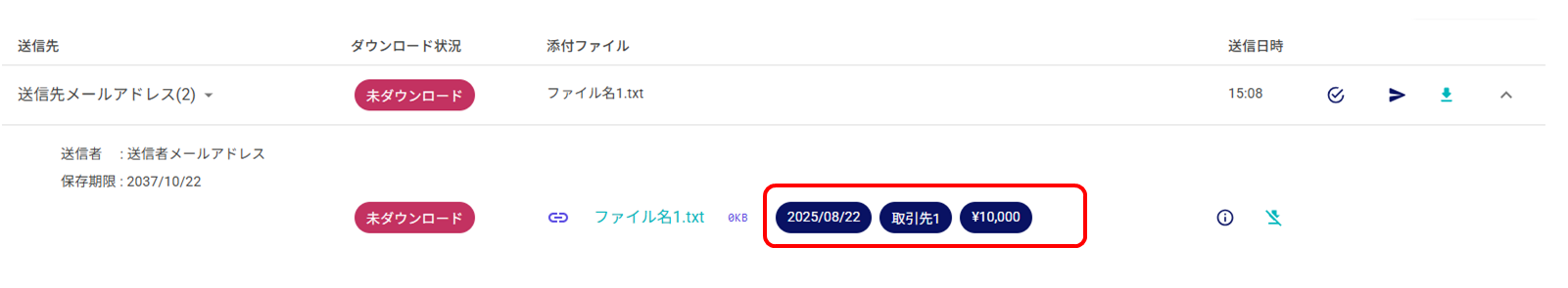 電子帳簿保存法の対象として送信したファイルの場合は、取引日付・取引先・取引金額が表示されます。