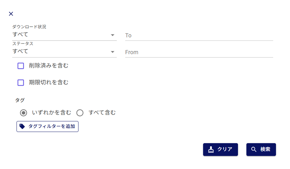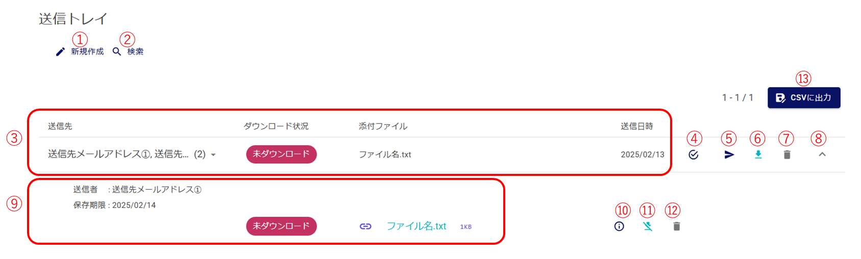 | ダウンロード状況 | ダウンロード状況が表示されます。 複数の宛先に送った場合、送信先のうち誰か一人でもダウンロードした場合、ダウンロード済みに変化します。 送信先別のダウンロード状況は⑩ファイル履歴を確認してください。 FAQ:宛先の中に未ダウンロードの人がいるにも関わらず、ダウンロード状況がダウンロード済になっている |
