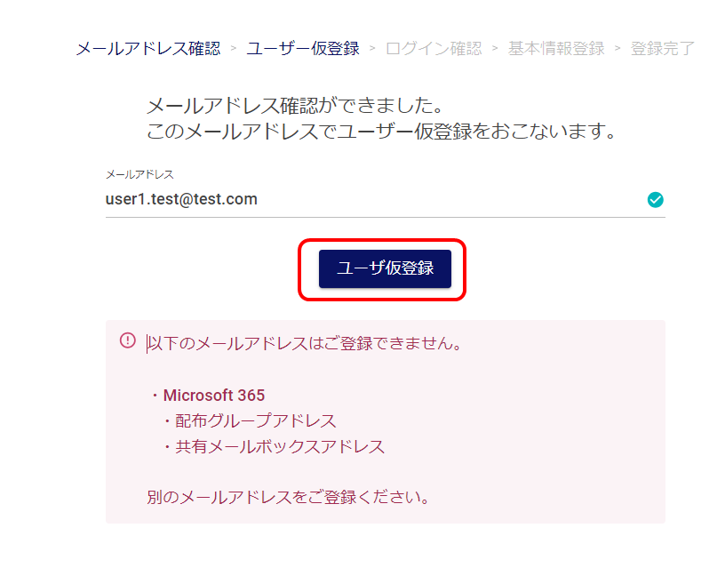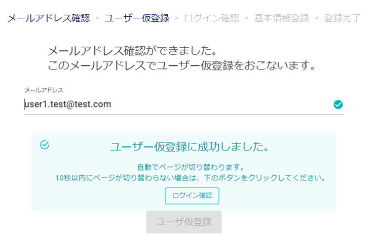 表示された画面にある、ユーザー仮登録のボタンをクリックすると、仮登録が完了します。