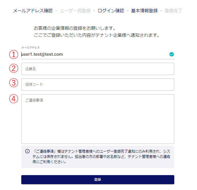 ユーザー登録時に、 招待コードを入力することで、基本情報の登録と、ファイルを送信したい企業への利用申請(テナントへの参加申請)を同時に行います。