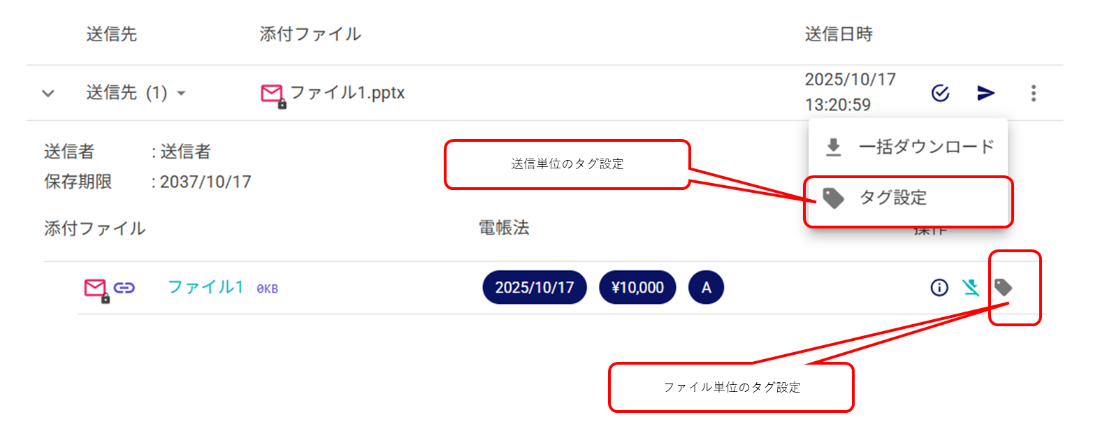 送信トレイのタグを表示をONにすると、ファイル単位・送信単位のタグが表示されるようになりました。